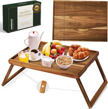 Mesa de bandeja de madera con patas plegables-Bandeja de desayuno de madera de acacia 100%-Escritorio plegable para Computadora Portátil para cama o sofá
