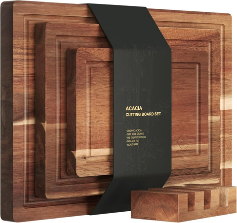 Placa De Corte De Madeira De Acácia Conjunto Com Base, 3 Tamanhos Orgânicos Suco Groove Tábuas De Corte, Ferramentas De Cozinha Prep